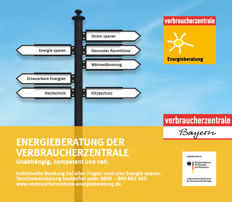 Die Energieberatung der Verbraucherzentrale Bayern bietet in Zusammenarbeit mit der Stadt Rosenheim i.d.R. am vierten Freitag im Monat zwischen 08:30 und 13:00 Uhr kostenfreie Beratungstermine (je 45 Minuten) in der Königstraße 15 (83022 Rosenheim) an. Mögliche Themen sind u.a. erneuerbare Energien, Energie sparen, energetische Sanierung und Fördermöglichkeiten.