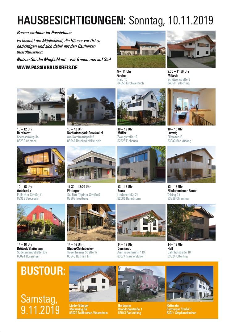Im Rahmen der Tage des Passivhauses 2019 wird am Samstag, den 9.11.2019 in Kooperation mit dem Landratsamt Rosenheim eine Bustour angeboten, am Sonntag, den 10.11.2019 zeigen die Bewohnerinnen und Bewohner Interessierten ihre Passivhäuser und beantworten Fragen.